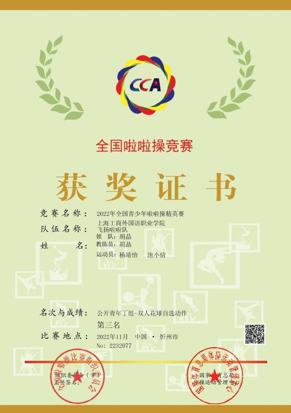 近日,由国家体育总局体操运动管理中心、中国蹦床与技巧协会啦啦操分会主办的2022年全国青少年啦啦操精英赛圆满落下帷幕,本次大赛采取线上比赛形式,比赛自11月12日至11月19日为期8天, 吸引了全国700多支参赛队伍近16000名运动员参加,规模远超历届大赛。经过激烈角逐,我校学生杨靖怡、池小倩组队的“飞扬”啦啦操代表队最终获得“公开青年组-双人花球自选动作”第三名的好成绩。