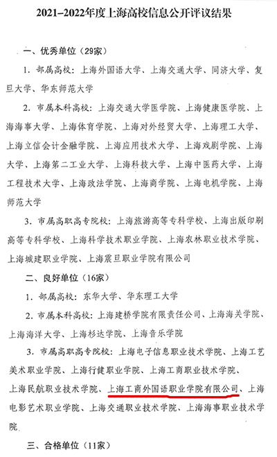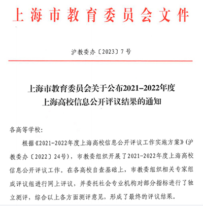 日前,上海市教育委员会公布2021-2022年度上海高校信息公开评议结果(沪教委办〔2023〕7号),该项评议工作在各高校自查基础上,市教委组织相关专家组成评议组进行网上评议,并委托社会专业机构对部分指标进行独立测评,在综合各方面测评意见基础上形成最终评议结果。我校再次获评上海高校信息公开工作“良好单位”。