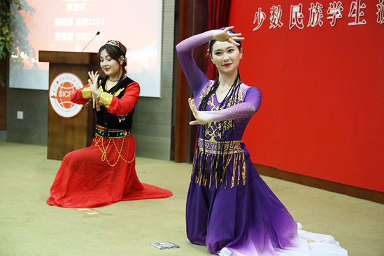 比赛的最后,娜则莱和麦迪娜同学带来一段热情洋溢的维吾尔族舞蹈,将现场氛围再次推向高潮,将少数民族能歌善舞的才艺风采尽情呈现,也展现出了我校少数民族学生昂扬的精神面貌。
