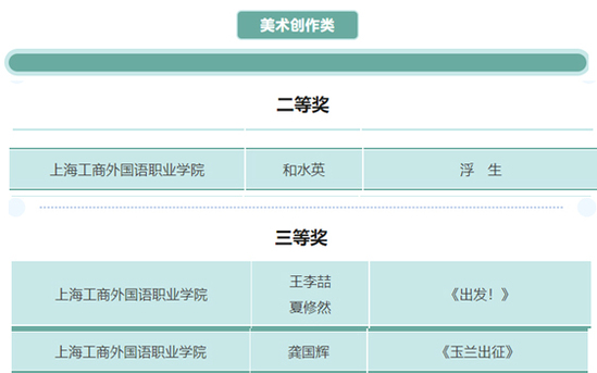 通过全市16所职业院校100余件作品的评比,创意设计学院和水英老师的作品《浮生》、王李喆老师的作品《出发!》、龚国辉老师的《玉兰出征》分别荣获美术创作类二等奖和三等奖,苏冰洁老师的作品《生命之路》荣获空间环境类三等奖。