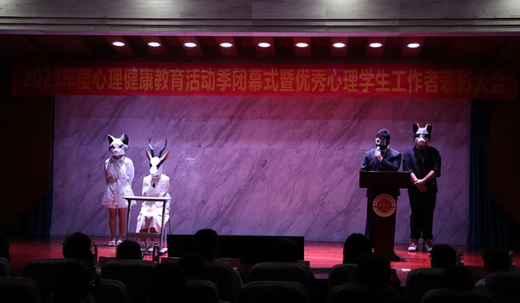 校园心理剧是同学们进行自我心理探索,完成心理调适的一种喜闻乐见的形式,段老师致辞后,新媒体与文法学院王紫屹同学带领的心理志愿者团队展演心理情景剧——《动物法则》。该情景剧揭示的是网络暴力现象,通过展演提醒观众:网暴过程中见到的不一定是事实,当大家站在网暴中心点,需要去听一听当事人的答案,在了解事情真相之前,不要过早去做评判。