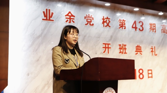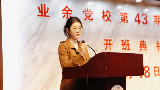 来自商学院的高腾飞同学作为优秀学员代表发言,分享了她在业余党校的学习体会和思想成长,并对未来的学习生活表达了期待。她鼓励新学员珍惜学习机会,严格自律,深化对党的理论知识的掌握,认真学习党的光辉历史和精神品格,将理论知识转化为实际行动,以增强党性修养,树立崇高理想。