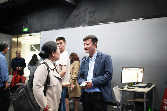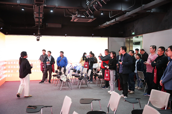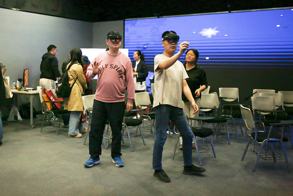 与会嘉宾参观学校元宇宙工作室,观看3D内容创作作品