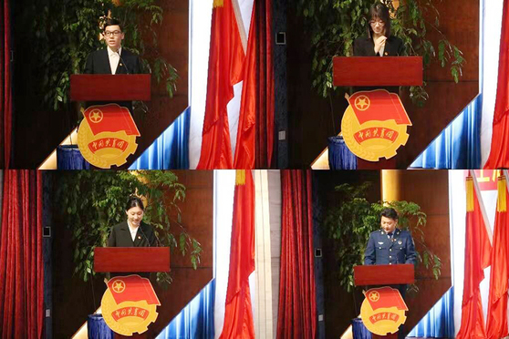随后,五四红旗分团委获奖代表新媒体与文法学院分团委书记袁神舟老师,五四红旗团支部获奖代表东方语言文化学院王依茹同学,共青团标兵获奖代表创意设计学院崔莹莹同学,星级社团获奖代表军旅社张佳牧同学,依次上台交流发言。