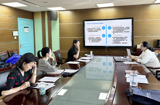 会议首先由上海市工商外国语学校贯通班综合韩语教师兼班主任孙莹、颜甜老师分享贯通班的教学现状和期中考试成绩情况。之后韩语系主任王璐介绍了19级贯通班专升本、出国情况和20级学生在高校学习情况,并分享了第六届“釜山外大-工商外杯”长三角高职高专韩国语技能大赛的情况。全体教师就22级的甄别考试形式进行讨论。