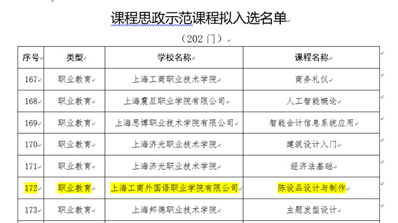 近日,上海市教委公布《2023年度上海学校课程思政示范课程、教学名师和示范团队拟入选名单》,创意设计学院在李宪锋院长指导下,和水英教授作为带头人,带领王李喆、王玉、苏冰洁、杨阳四位课程团队成员,成功打造《陈设品设计与制作》并入选上海市院校高职教育课程思政示范课程。