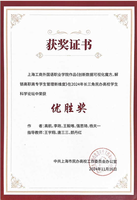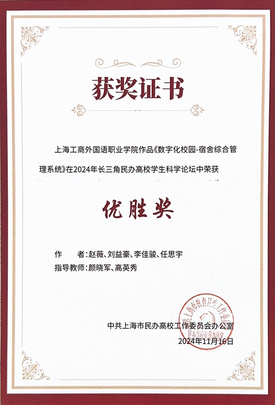 在该论坛的项目征集中,共有30个项目入围此次2024年长三角民办高校学生科学论坛,智能学院师生团队申报的两个项目均在此次论坛的评选中被评为优胜奖,分别为王宇翔、唐三三和颜丹红老师指导的《创新数据可视化魔方,解锁高职高专学生管理新维度》、颜晓军和高英秀老师指导的《数字化校园—宿舍综合管理系统》。同时,学校荣获“优秀组织奖”。