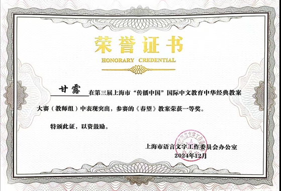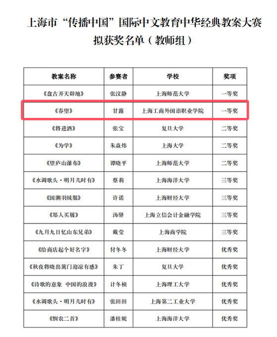 12月8日,上海市“传播中国”国际中文教育中华经典教案大赛(教师组)总结大会在复旦大学隆重举行。我校艺术设计与传媒学院甘露老师在此次比赛中脱颖而出,荣获一等奖,成为唯一获此殊荣的高职院校教师。