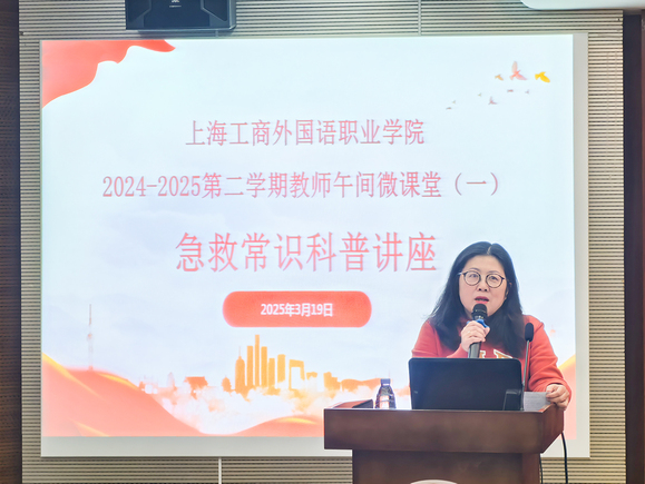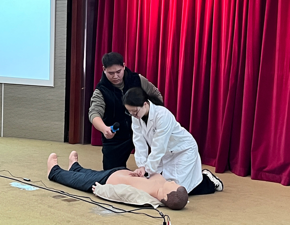 本次讲座邀请了惠南社区卫生服务中心全科主治医师、康复医师,团支部书记孙燕婷医生担任主讲。她以《人人都可以是生命守门人》为题,介绍了常见急救场景的应急救护方法,如心肺复苏法、海姆立克急救法等。她以通俗易懂的语言,清晰明了地讲解了心肺复苏(CPR)的标准操作流程,包括初步判断、紧急呼救、胸外按压、开放气道、人工呼吸等关键步骤,并强调了按压速率(每分钟100-120次)、按压深度(至少5-6厘米)以及按压与人工呼吸比例(30:2)等要点;同时现场演示了正确的急救操作步骤。在互动环节,部分教职工根据提供的模拟道具亲自实践操作,孙医生现场进行指导纠正。