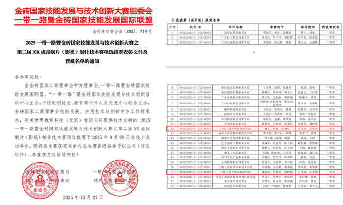 2025一带一路暨金砖国家技能发展与技术创新大赛——第二届XR虚拟制片(影视)制作技术赛项选拔赛于10月27日公布成绩,我校艺术设计与传媒学院游戏艺术设计专业学子表现优异,两支参赛队伍分别以全国第12名、第21名的成绩荣获二等奖,成功晋级全国总决赛。