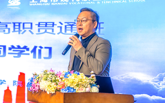 上海市现代职业技术学校数字艺术专业群负责人赵崝老师发表寄语。他从中职阶段视角肯定了贯通培养模式的优势,并对同学们未来的持续成长表达了殷切期望。
