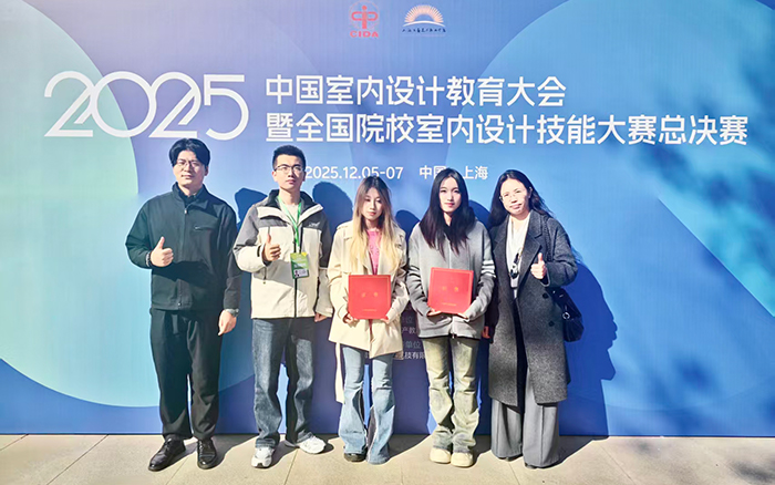 12月5日-7日,2025年中国室内设计教育大会暨全国院校室内设计技能大赛总决赛在上海工艺美术职业学院举行。在我校艺术设计与传媒学院统筹组织下,副院长、环境艺术设计专业主任和水英教授带队,指导老师王南奇、何孟闰携环艺2301班学生毛愉悦、肖盈盈参赛。经过激烈角逐,团队最终从全国104支高职参赛队伍中脱颖而出,荣获三等奖;同时,王南奇、何孟闰两位指导老师被授予“优秀指导老师”称号。