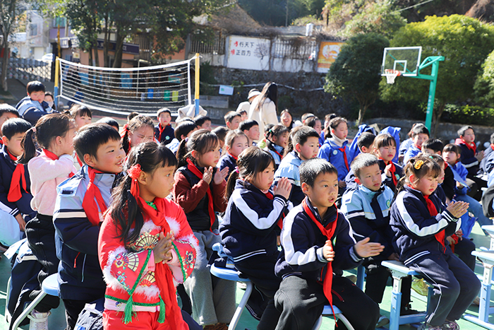 作为中心学校首次隆重举办的元旦文艺汇演,精彩纷呈的节目串联起孩子们的成长与感恩。经过左月明老师的指导,同学们发掘了自身的“隐藏技能”,也学会了如何更加勇敢、自信地登台展现自我。哈尼族童谣《其多列》充满童真童趣,《星光恰恰恰》《小螺号》等合唱曲目旋律明快,《妈妈格桑拉》《乡间的小路》《强军战歌》以及《萱草花》《大鱼》等独唱、合唱饱含深情,华尔兹舞蹈《第二圆舞曲》、创意节目《说唱脸谱》《校园小戏迷》各具特色,歌唱及朗诵《我相信》《我们的青春中国》、舞蹈《向快乐出发》则展现出少年意气,师生共唱的《如愿》更是将现场氛围推向高潮。孩子们用自信的表演、真挚的情感,展现了在支教老师帮扶下的成长蜕变,也让这场跨越480公里的相聚充满温情。