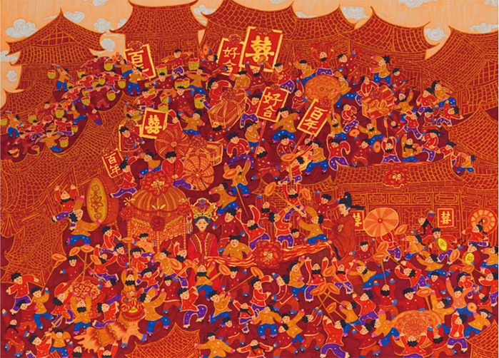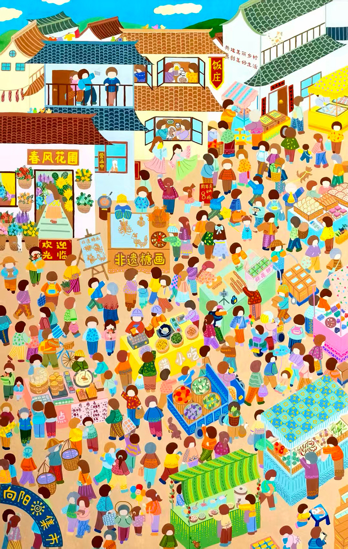 两位同学的创作之路,始于徐悲鸿艺术学院“非遗进校园、课程融文化”的育人土壤。学院艺术设计少儿美术专业秉持“植根地域文化、培育匠心人才”理念,将国家级非遗项目上海金山农民画纳入专业人才培养方案。在李宪锋院长引领下,由伴舒艺绘农民画工作室负责人郑舒文牵头,以工作室特色指导模式系统传授农民画构图夸张、色彩艳丽、题材民俗的艺术特征与创作技法。同时,通过“看文化、听文化、学文化、用文化、创文化”五步教学法,引导学生深化对地域文化的理解与认同。此次入选作品,正是同学们将课堂所学、工作室孵化相结合的集中体现。作品以农村民俗为主题,运用农民画特有的饱满构图与明艳色彩,生动描绘婚嫁、赶集等生活场景,融非遗根脉于时代新意,诠释“新生活・新风尚・新年画”的展览主旨,成为地域文化元素创新表达的典型范例。