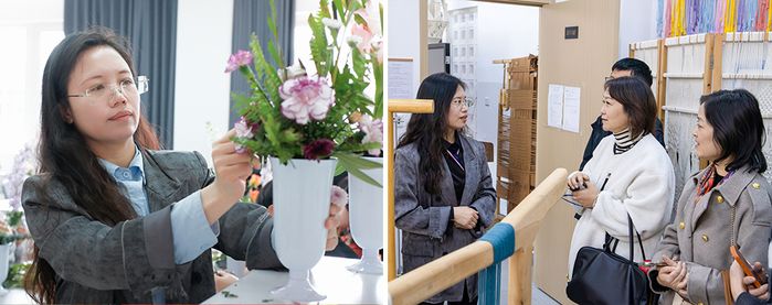 作为禾风织造工作室负责人,和水英教授带领工作室团队聚焦传统编织技艺现代化转化,兼顾技艺传承、教学实践与社会服务。自2017年工作室成立以来,研发的非遗类作品斩获百余项赛事奖项,部分课题成果成功应用于商业软装设计实践。积极推动非遗文化走出去,组织开展“非遗工艺身边行”活动,推动非遗结艺进校园、进社区、进企业,深化校企合作、校社联动与文化融通;同时,推动学校与上海艺术品博物馆共建实践教学基地,将博物馆的专业馆藏、行业资源转化为教学资源,实现“艺术实践从校园走向社会”的育人闭环,助力学生在真实项目中提升专业能力,践行应用型艺术人才培养理念。